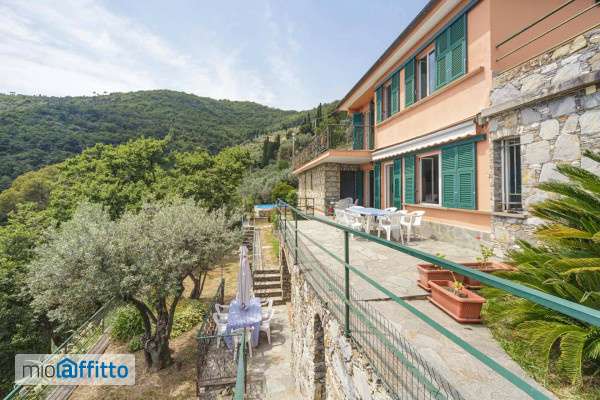 [ita] Disponibile da: 09 10 2025 Mensilità minime prenotabili: 1 Per prenotare l'annuncio clicca sul bottone "prenota Qui" [eng] Available from: 09 10 2025 Minimum months rental: 1 to book the listing click on the button 'book here' Codice cin appartamento a : it010047c27x2tzjd7 Codice cin appartamento b : it010047c2r2kzhbt9 Villa singola ed unifamiliare composta di due appartamenti , giardino e bosco ubicata nella zona collinare e residenziale di Recco ed a circa 100 metri sul livello del mare. Ha una magnifica vista sulla cittadina e sul mare. Sorge su circa 3000 mq di terreno terrazzato alla ligure coperto da alberi d’olivo secolari e circa 5000 mq di bosco di querce e rovere che fa parte della proprietà. Parcheggio nel giardino per almeno dieci auto. La villa è a tre livelli intercomunicanti con scala esterna ed interna: i due livelli più alti compongono l’appartamento a e il livello più basso l’appartamento b. Appartamento a: Tre camere. Quattro bagni completi di doccia. Circa 200 mq su due livelli collegati con scala interna ed esterna. Ha al piano terra sala soggiorno con camino e zona studio attrezzata con divani letto (per 4 posti), cucinino, zona pranzo, ripostiglio e bagno grande con doccia e lavatrice. Al piano superiore ha tre camere da letto (per totali 8 posti letto), tutte con bagno privato (3 bagni hanno doccia e uno anche vasca idromassaggio Jacuzzi). All’Esterno, al livello del soggiorno, c’è un terrazzo di circa 100 mq coperto da telone con apertura chiusura motorizzata ed attrezzato con tavolo e sedie da esterno. Altro terrazzo di circa 100 mq al livello delle camere da letto. Appartamento b: Circa 100 mq, è ad un solo livello. Due camere. Due bagni completi di doccia. Si entra in una sala di circa 50 mq con porta finestra scorrevole di m. 3,50 con vista panoramica su Recco e accesso diretto al giardino. Sul lato destro c’è la zona pranzo e la cucina attrezzata. In fondo alla sala c’è il corridoio e un bagno grande con doccia e lavatrice. Ha 2 camere da letto (posti 2+3 ), due bagni ed un soggiorno con quattro divani letto (2 da una piazza e mezza e due singoli ). Quindi pax 5 nelle due camere e da 4 a 6 nella sala. All’Esterno ha un giardino di circa 800 mq recintato ed un terrazzo di circa 6 mq attrezzato con tavolo, sedie ed ombrellone. Camere da letto – totale n. 5 Posti letto complessivi n. 20 : n. 12 nelle cinque camere e n. 8 in divani letto nei due soggiorni Bagni n. 6 Cucine attrezzate n. 2 Posti auto all’aperto : n. 10