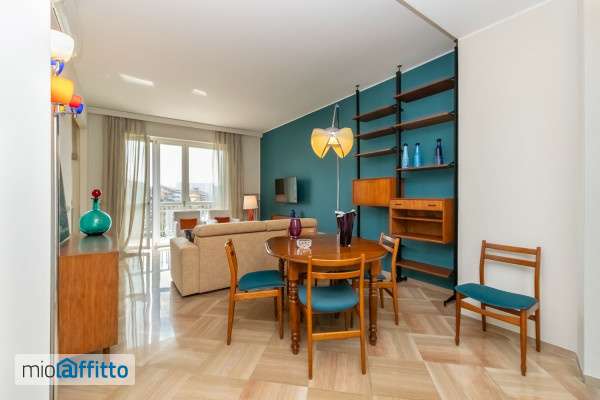 Torino, Corso Ferrucci angolo Via Cialdini, di fronte al Tribunale, al 5° piano di un edificio di fine anni '60, affittiamo appartamento panoramico, ristrutturato a nuovo e completamente arredato di 114 mq. Con posto auto coperto nel garage condominiale. Composizione interna: ingresso, soggiorno doppio con zona pranzo e zona conversazione, cucina a vista, due camere, due bagni completi con cabina doccia, cabina armadi, due ampi balconi panoramici. Caratteristiche: porta blindata; esposizione angolare; pavimenti in marmo nelle zone comuni e parquet nelle camere; infissi con doppi vetri; cucina completa con fornello a gas, forno, microonde, lavatrice asciugatrice, lavastoviglie, frigo; un bagno con finestra, uno con areazione forzata; eleganti arredi di design stile vintage; aria condizionata; acqua calda con boiler a gas; ampi balconi con vista verso la collina; riscaldamento centralizzato; la cantina completa l'offerta. Il palazzo è in ottime condizioni, ha portineria e doppi ascensori. Non sono ammessi animali domestici. Il garage, con accesso da Via Cialdini, è situato al 1° piano ha altezza massima di mt 1,90. Volendo è disponibile un secondo posto auto (scoperto) nel garage ad Euro 80 mese. Libero dal 01 07 2026. Contratto con cedolare secca. L'appartamento di Corso Ferrucci si trova in zona Cit Turin, vicino a Piazza Adriano e Corso Vittorio Emanuele ii, a pochi isolati dal grattacielo Intesa San Paolo, non lontano dalla Metro Bernini e dalla stazione di Porta Susa.