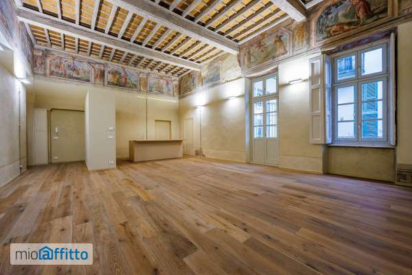 Nello splendido, seicentesco palazzo Frichignono di Castellengo, sito all'incrocio di Via San Dalmazzo e Via Barbaroux, grande appartamento al piano nobile, appena ristrutturato. L'ingresso porta direttamente al magnifico salone, di oltre 60 mq, con soffitti molto alti, travi a vista decorate e affreschi originali restaurati, corredato di cucina a vista. Il salone è collegato ad un bagno per ospiti, e alla camera padronale, di circa 25 mq, con bagno privato e grande cabina armadi. L'intero appartamento affaccia esclusivamente sui cortili interni e gode pertanto di estrema tranquillità. Una location di grande fascino e prestigio, che ci riporta alla nobiltà del passato, molto adatta anche a showroom di rappresentanza. Il canone di locazione indicato è comprensivo delle spese condominiali, il riscaldamento è a pavimento, autonomo, con caldaia a condensazione anche per la produzione di acqua sanitaria istantanea e termostati ambiente. L'appartamento é stato completamente ristrutturato, l'ape é riferito allo stato precedente alla ristrutturazione, la nuova certificazione é in fase di rilascio.
