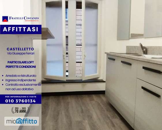 Castelletto Via Ferrari particolare loft arredato castelletto (Via Giuseppe Ferrari) Rif. : ar201 in esclusiva – Proponiamo particolare loft arredato e recentemente ristrutturato di mq. 55 circa, movimentato su due livelli. Questa singolare proposta è stata ricavata da un locale commerciale (attuale categoria catastale c 2), del quale conserva l'ingresso indipendente direttamente dalla strada. Entrando troviamo la zona notte con letto matrimoniale, salendo di qualche gradino si apre la zona giorno composta da una piccola cucina (completa lavello, piano cottura ad induzione, frigorifero, penisola con sgabelli), un salottino con divano, ampio antibagno con lavatrice e lavabo, zona servizio completa di doccia e sanitari. E' dotato di impianto fan coil per il riscaldamento e la climatizzazione. L'immobile viene affittato esclusivamente ad uso non abitativo, a persona singola referenziata con contratto annuale. Non e' possibile mettere la residenza. Affitto mensile Euro 500 (restano esclusi consumi luce, acqua fredda e tari). Per informazioni e visite telefonare al n. 0103760134 Valutiamo gratuitamente il Vostro immobile, contattateci per un sopralluogo immediato. Foto ed informazioni qui contenute hanno scopo illustrativo e non costituiscono elemento contrattuale. Le eventuali planimetrie non sono in scala, ma puramente rappresentative degli spazi interni. Condizioni e disponibilità della proposta sono soggette a variazione. Fratelli costanzo Agenti Immobiliari dal 1955