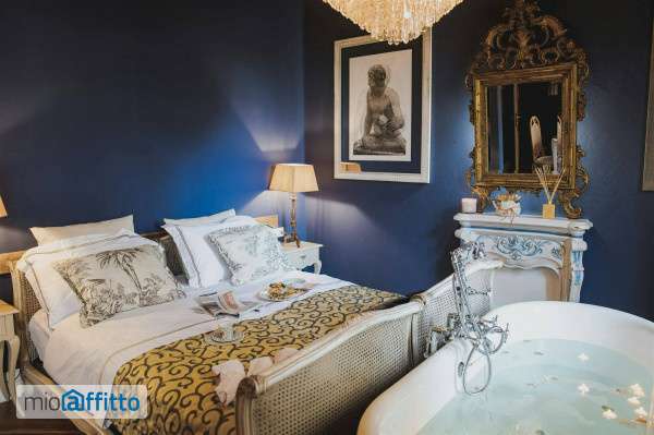 This stylish one-bedroom apartment on the first floor of Via Corridoni 16 in Florence is a unique and beautifully curated space, ideal for a medium to long-term stay. Designed with personality and charm, the apartment combines classic elegance with modern comfort, featuring deep blue walls, high ceilings, and statement lighting that gives the space a warm, refined atmosphere. The bedroom is the heart of the apartment, with a comfortable double bed, high-quality linens, vintage bedside tables, and soft lighting. A standout feature is the freestanding bathtub positioned at the foot of the bedperfect for unwinding after a long day. The space is cozy but elegant, with thoughtful details like art prints, a decorative mirror, and handpicked accessories throughout. The dining area is both practical and inviting, with a round table, cane-back chairs, and a fully equipped kitchenette cleverly hidden behind custom cabinetry. It includes a microwave, everything you need for home-cooked meals or relaxed dinners in. The bathroom, separate from the main living area, is finished in travertine stone and includes a walk-in shower with rainfall head, a natural stone sink, and both a toilet and bidet. Wooden floors run throughout, adding warmth and continuity to the apartment. Additional features include air conditioning, Wi-Fi, a tv, sound system, and a wardrobe area with plenty of storage space. This apartment is perfect for someone looking for more than just a place to sleepit's a comfortable, inspiring home base in Florence, ideal for professionals, creatives, or couples planning an extended stay. Ntraduci la descrizione dell'annuncio in italiano