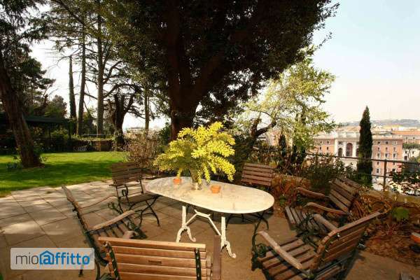 Situato all’interno di un meraviglioso parco privato ed immerso in una rigogliosa vegetazione, a 200 mt da Piazza del Popolo e Villa Borghese, villino unifamiliare su due livelli totalmente ristrutturato con grande gusto. Circa 100 mq. Portierato. Dall'incantevole giardino si gode di una vista spettacolare sulla città e verso la collina del Gianicolo con incantevoli tramonti. Questa elegante casa si compone di un piccolo ingresso, ampio salone con vetrate che affacciano sul giardino (300 mq), soffitti altissimi in legno, moderna cucina, camera da letto matrimoniale con bagno, bagno ospiti, soppalco con camera da letto singola. Al piano sottostante, una camera da letto doppia con bagno con vasca, studio o terza letto con bagno, lavanderia (lavatrice e asciugatrice). La villa è fornita di tutti i comfort. Richiesta €6. 500 e' compreso il parcheggio oltre al servizio del giardiniere. No uso recettivo